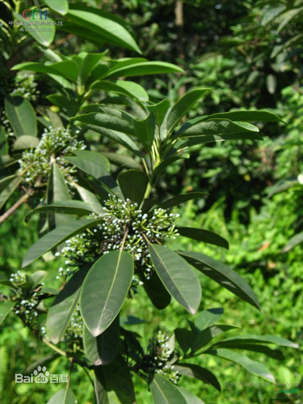 灌木,高1.5-4米;小枝灰褐色,径3-5毫米,具稀疏皮孔。叶纸质,阔椭圆形或倒卵形,长12-16厘米,宽4-9厘米,先端钝或圆形,具短尖头,基部阔楔形,全缘,略反卷,干后两面绿色,叶面具光泽,叶背多少被白粉,具细小乳突体,侧脉8-11对,在叶面清晰,叶背突起;叶柄长4-8厘米,上面平或略具槽,径约2毫米。总状花序腋生,长2-3厘米,雄花花梗长8-10毫米;花萼盘状,径约4毫米,3-4浅裂,裂片阔三角形;雄蕊9-10枚,长约3毫米,花药长圆形,侧向压扁,药隔发达伸长,先端内弯,花丝极短;雌花花梗长5-6毫米;苞片卵形,长约3毫米;萼片3-4,阔三角形,长约1.5毫米;子房椭圆形,长1.5-2毫米,花柱短,柱头2,直立,先端外弯。果序长4-5厘米,密集排列;果卵圆形,较小,长约7毫米,被白粉,具小疣状突起,先端具宿存柱头,基部具宿萼。花期4-6月,果期8-11月。