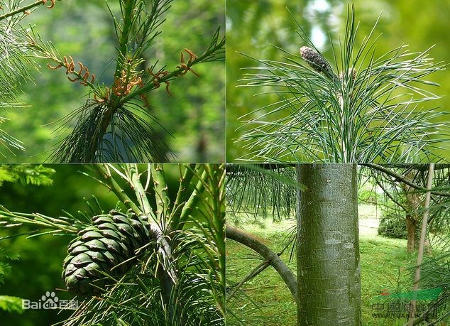 针叶5针一束,稀6-7针一束,长8-15厘米,径1-1.5毫米,边缘具细锯齿,仅腹面两侧各具4-8条白色气孔线;横切面三角形,单层皮下层细胞,树脂道通常3个,中生或背面2个边生、腹面1个中生,稀具4-7个树脂道,则中生与边生兼有;叶鞘早落。子叶10-15枚,针形,横切面三角形,长4-6.4厘米,径约1毫米,先端渐尖,全缘或上部棱脊微具细齿;初生叶条形,长3.5-4.5厘米,宽约1毫米,上下两面均有气孔线,边缘有细锯齿。